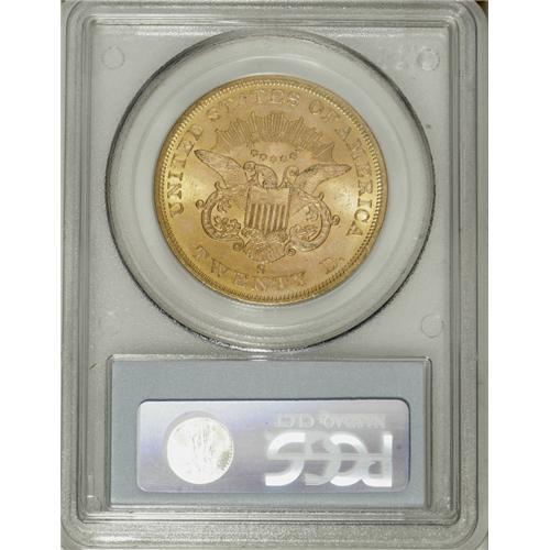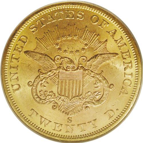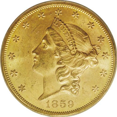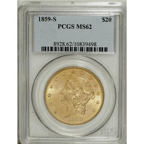 <B>1859-S $20 MS62 PCGS.</B></I> Like most of the early San Francisco gold issues, the 1859-S double eagle saw heavy circulation, and few survived unworn. Yet the total mintage of more than 636,000 pieces dwarfs the figures for both the Philadelphia and New Orleans issues for that year, and of the three, only the San Francisco double eagle is available in anything above minimal Mint State.<BR> The key is available, not readily available, as such pieces are still condition rarities, especially in MS62. One such example, well struck and softly lustrous, is offered here. The apricot-gold surfaces are lightly abraded overall, and a slightly deeper mark affects the hair behind the coronet, but the overall visual appeal is high. Population: 15 in 62, 1 finer (11/06).<BR><BR><b>Shipping:</b> Coin/Currency (<a target="_blank" href="http://www.heritageauctions.com/common/shipping.php">view shipping information</a>)
