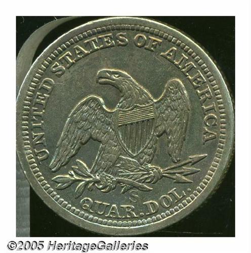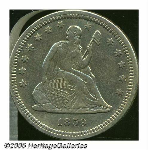 <B>1859-S<25C>--Cleaned, Retoned--AU50 Uncertified.</B></I> The deep burgundy surfaces have taken on hints of dark green and gold. Circulation is most evident across the high points of the obverse. A few small contact marks, scattered, are also noted.