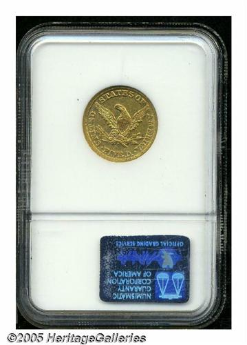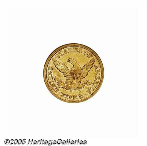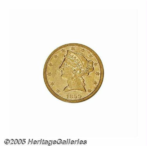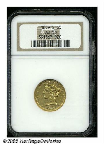 <B>1859-S<$5> AU58 NGC.</B></I> An elusive mintmarked No Motto half eagle that was struck in a year when San Francisco gold production was concentrated on double eagles. Heavy circulation caused it to be even scarcer than its mintage of 13,220 pieces might indicate. This issue is seldom seen above VF, with Akers only recording the appearance of 10 XF coins over a 35-year period. Mint State pieces are virtually unknown. The surfaces are a copper-green in color and show few appreciable marks, with striking details that are typically defined for this issue. A pair of small abrasions cross to form an "X" in the left obverse field.