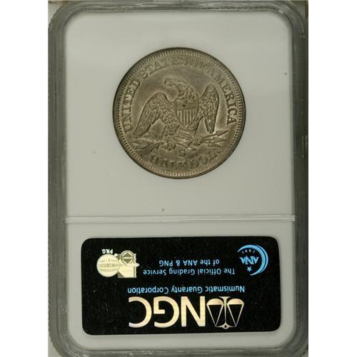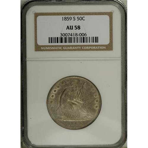 <B>1859-S 50C AU58 NGC.</B></I> Well struck with only faint typical weakness noted on the top of Liberty's head, and on a few obverse stars. Pleasing luster remains evident on each side, and the essentially untoned surfaces are virtually mark-free. Faint highpoint wear limits the grade. Census: 9 in 58, 19 finer (11/06).<BR><BR><b>Shipping:</b> Coin/Currency (<a target="_blank" href="http://www.heritageauctions.com/common/shipping.php">view shipping information</a>)