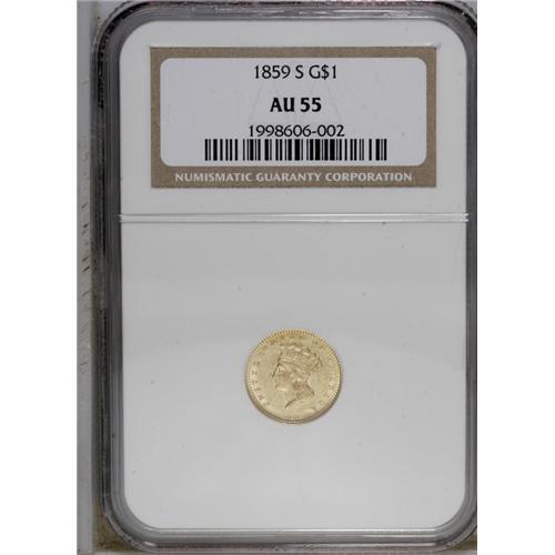 1859-S G$1 AU55 NGC. Light, even wear is noted on this