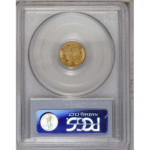<B>1859-S<G$1> AU58 PCGS.</B></I> A hint of highpoint friction on the well struck devices keeps this piece from Mint State. Original luster is present on the mustard-gold surfaces, but subdued. Population: 6 in 58, 9 finer (8/06).