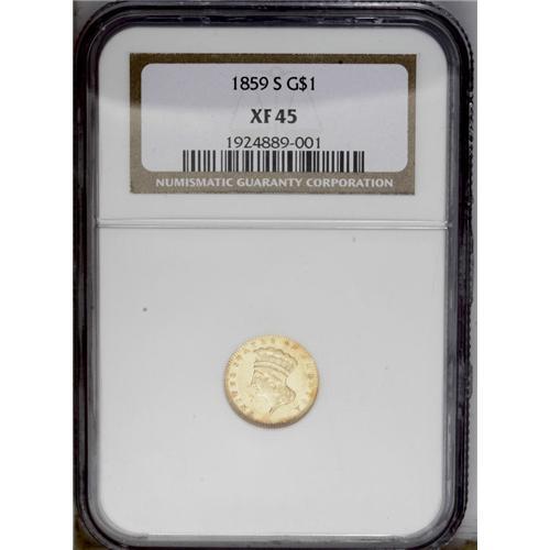 1859-S G$1 XF45 NGC. Peach-gold surfaces with traces o 1859-S[G$1] XF45 NGC.
