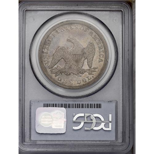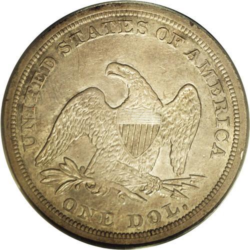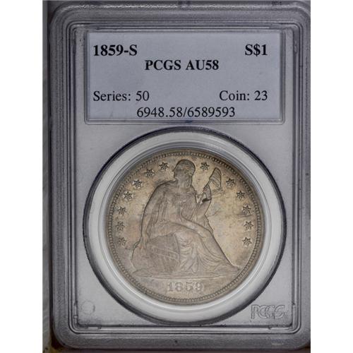 <B>1859-S<img border='0' src='http://www.heritagecoins.com/images/star.gif' width=10 height=10>$1> AU58 PCGS.</B></I> A wonderful example of this issue, the first dollar from the San Francisco Mint. The fields show delicate golden-gray hues that are evenly distributed on both sides. The strike is sharp, without significant fault. A trivial planchet flake has come off the coin near Liberty's right (facing) arm, and a small void is seen on Liberty's wrist on her pole arm. There is an edge tick over the final A of AMERICA, and a light die crack joins the bases of TATES O. A paltry 20,000 pieces were struck, few of which remain in high collectible grades. A coin for the specialist who demands eye appeal and excellent surfaces. Population: 18 in 58, 18 finer (3/06). <BR><BR><B>Important notice:</B> Heritage usually auctions material at the rate of 200-250 lots per hour. On some occasions eBay Live bid software or the Internet may not be able to keep up with the pace of the auction. We recommend placing a realistic absentee bid now as insurance to avoid disappointment. Occasionally the auctioneer may eliminate or reject an eBay Live bid, and the auctioneer may also reopen a lot after the close of the eBay live bidding (usually because we missed an audience bid), and may reject your bid even if it shows you as the winning bidder. By bidding via eBay Live, you agree that Heritage may award the lot to another bidder at its sole discretion under the circumstances described above or any other reasonable circumstances. Since eBay bids are not shown to us until we open the lot on the floor, we treat those bids just like floor bids. In most cases the floor responds before the eBay bid is presented to us, due to Internet lag time, so for consistency we have made it a policy that floor bids are always considered first over tie eBay live bids. Also please note that all Heritage lots purchased through eBay Live carry a 20% Buyer's Premium. Please make sure you read the Terms and Conditions before you bid. This lot is being auctioned in conjunction with a live floor auction by Heritage Galleries & Auctioneers. All final auction and invoice information will be supplied by Heritage Galleries & Auctioneers, and all other information should be considered preliminary. Lot:2185 <BR><BR><B>Winning Notification and Billing:</B> After the FINAL session in this auction is complete, Heritage will send e-mail and snail mail invoices. This process normally takes several days. All final auction and invoice information will be supplied by Heritage Galleries & Auctioneers, and all other information should be considered preliminary. <BR><BR>This auction will be conducted on a live auction floor and over the Internet through eBay Live. If you choose to place an absentee bid, please take a moment to <font color='#0000ff'><u><a href='http://pages.ebay.com/liveauctions/help/before/laabsentee.html'>learn how eBay Live absentee bidding works</a></u></font><font color='#000000'>