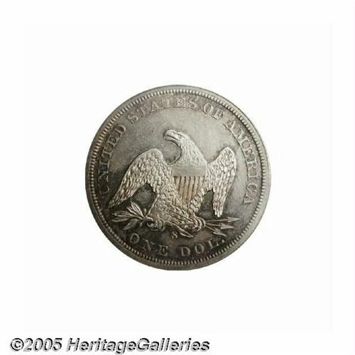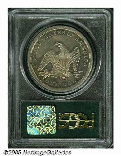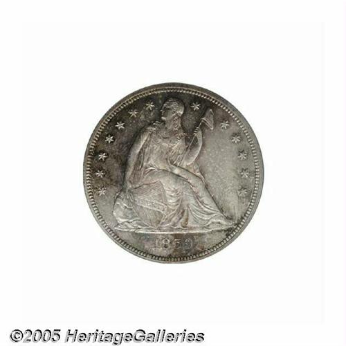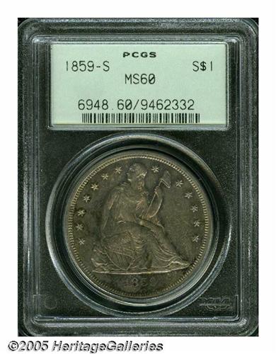 <B>1859-S<S$1> MS60 PCGS.</B></I> The San Francisco Mint struck at least 100,000 Half Dollars every year between 1856 and 1877. However, emissions of Seated Dollars were much scarcer and smaller. The 1870-S is a landmark rarity, and the 1873-S is unknown despite a recorded mintage of 700 pieces. Thus, the only collectible S-mint issues of the design are the No Motto 1859-S and the Motto 1872-S. Both are rare, however, due to a combined production of only 29,000 pieces. Bowers (1993) postulates that between 750 and 1,250 1859-S Dollars exist in circulated grades, but only estimates about ten pieces in Mint State. The present older holder example, therefore, is of great importance to the dedicated specialist. Splashes of orange, aqua, and cream-gray color endow the lightly marked and moderately prooflike surfaces. The strike is not full on the eagle's neck or left (facing) leg, but is generally crisp. Population: 3 in 60, 12 finer (6/05).<BR><I>From The Dr. John L. Pellegrini Collection of Liberty Seated Dollars.</B></I>