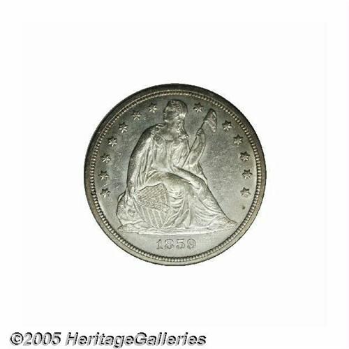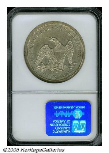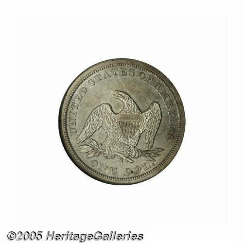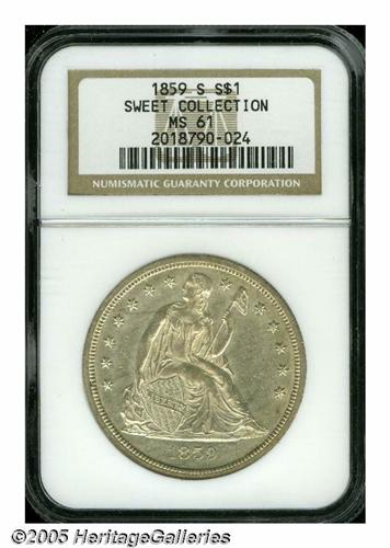 <B>1859-S<S$1> MS61 NGC.</B></I> Ex: Sweet Collection. The 1859-S is the premier issue of the denomination at the San Francisco facility and the only No Motto S-mint. Ten pairs of Seated Dollar dies were shipped from the Philadelphia Mint and, since only 20,000 coins were struck, it is highly likely that most dies remained unused. Extensively used for export, only a small percentage of the original production survives, particularly in AU and Uncirculated grades. This example is essentially untoned and shows repunching at the bases of the 1 and 8 in the date, as seen on other better grade pieces. Numerous scuffy abrasions are concentrated in the obverse fields. Population: 4 in 61, 8 finer (6/05).