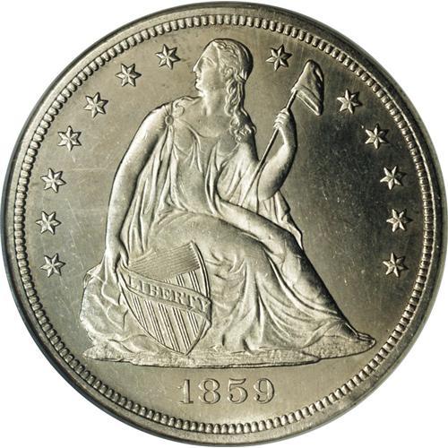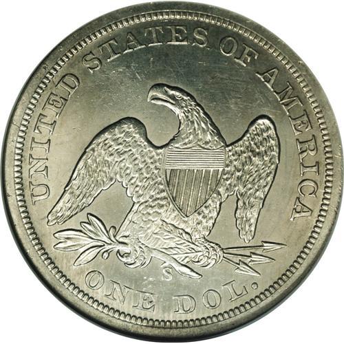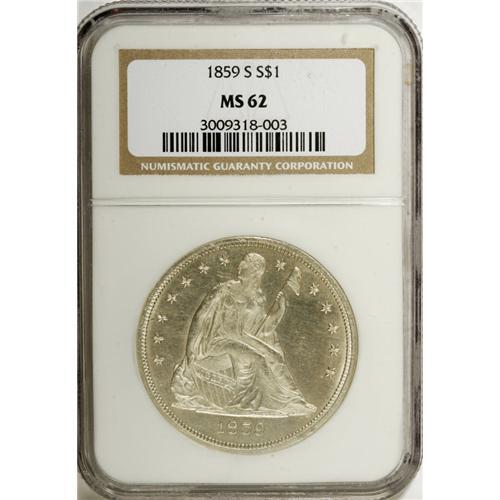 <B>1859-S S$1 MS62 NGC.</B></I> Only 20,000 business strikes were coined, and the issue is scarce in all grades. However, more coins are known than the low mintage would suggest. Since this mintage was produced entirely for export to the Orient, perhaps some pieces were returned. Regardless, Mint State coins are rare, as most survivors known fall in the VF-XF range. This appealing and lustrous piece boasts untoned silver surfaces with a glint of gold on each side. The strike is bold, but both sides show not only raised die polishing lines but incuse hairlines, the latter likely accounting for the grade. Census: 6 in 62, 5 finer (11/06).<BR><BR><b>Shipping:</b> Coin/Currency (<a target="_blank" href="http://www.heritageauctions.com/common/shipping.php">view shipping information</a>)