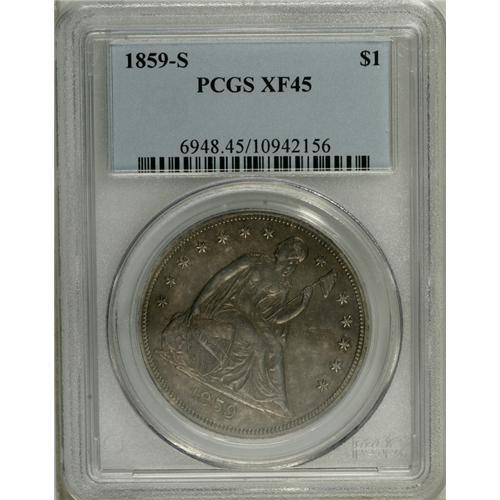 <B>1859-S S$1 XF45 PCGS.</B></I> Intricately patterned violet, rose, and olive colors mesh on this solidly struck and appealing silver dollar. Light, even wear characterizes the devices, and occasional minor abrasions are noted in the fields. Population: 27 in 45, 72 finer (11/06).<BR><BR><b>Shipping:</b> Coin/Currency (<a target="_blank" href="http://www.heritageauctions.com/common/shipping.php">view shipping information</a>)