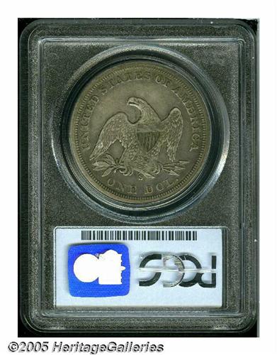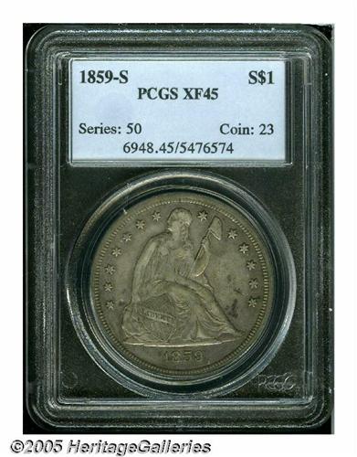 <B>1859-S<S$1> XF45 PCGS.</B></I> The sole S-mint issue of the No Motto type, the 1859-S has a scant production of 20,000 pieces, few among which were set aside since the issue is very scarce across all grades. This boldly detailed representative has dove-gray and olive color. Wispy slide marks are expected of the grade, however, no singularly heavy marks are apparent. Population: 23 in 45, 67 finer (3/05).