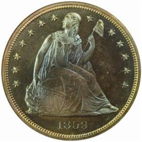 <style type="text/css"> body, td, th { font-family: Arial, Helvetica, sans-serif; font-size: 12px; color: #482424; margin: 0px; padding: 0px; } #header { background-image: url(http://www.bowersandmerena.com/ebay/images/template_v3_01.gif); clear: both; background-color: #590303; border-top-width: 2px; border-top-style: solid; border-top-color: #B38C4F;}#header #header_wrapper { height: 75px; clear: both; width: 800px; margin-right: auto; margin-left: auto; background-image: url(http://www.bowersandmerena.com/ebay/images/template_v3_03.gif); background-repeat: no-repeat; background-position: right; color: #F3EDCC;}#header #header_wrapper #header_logo { float: left; height: 75px; width: 444px; background-image: url(http://www.bowersandmerena.com/ebay/images/template_v3_02.gif); background-repeat: no-repeat; font-size: 10px; text-transform: capitalize; color: #B38C4F;}#header #header_wrapper #header_right { float: left; height: 75px; width: 356px; text-align: right;}#header #header_wrapper #header_right #headerLoginBtn { margin-bottom: 30px;}#header #header_wrapper #header_right input#txtSearch { color: #B49056; border: 1px solid #B49056; width: 175px; padding-top: 3px; padding-right: 3px; padding-bottom: 4px; padding-left: 3px;}#nav { height: 37px; background-image: url(http://www.bowersandmerena.com/ebay/images/template_v3_05.gif); clear: both;}#nav #nav_wrapper { height: 35px; width: 800px; margin-right: auto; margin-left: auto; border-left-width: 1px; border-left-style: solid; border-left-color: #B38C4F;}#nav #nav_wrapper a { padding-right: 15px; padding-left: 15px; border-right-width: 1px; border-right-style: solid; border-right-color: #B38C4F; height: 25px; padding-top: 10px; display: block; float: left; text-decoration: none; font-weight: bold; color: #5D0303;}#nav #nav_wrapper a:hover { color: #B38C4F;}#nav #nav_wrapper #search { float: right; padding-top: 7px;}#nav #nav_wrapper #search #txtSearch { font-family: Arial, Helvetica, sans-serif; font-size: 10px; text-transform: uppercase; color: #D2AE75; border: 1px solid #B38C4F; padding: 3px;}#content_bgd { background-image: url(http://www.bowersandmerena.com/ebay/images/template_v3_09.gif); background-repeat: repeat-y; background-position: center; padding-top: 15px; padding-bottom: 15px; background-color: #FBFBDB;}#content_wrapper { clear: both; height: auto; width: 800px; margin-right: auto; margin-left: auto;}.LotDetailWhite{ line-height:normal; font-size:13px; font-family: arial,helvetica,sans-serif; color: White; font-weight: bold;}.LotDetailInformation{ line-height:normal; font-size: 13px; font-family: arial,helvetica,sans-serif;}.LotDetailMessage{ line-height:normal; font-size: 13px; font-family: arial,helvetica,sans-serif; color: red;}}tr.HeaderAuctionTitle td { color: #000000; font-weight: bold; padding: 2px; background-image: url(http://www.bowersandmerena.com/ebay/images/template_v3_05.gif); background-repeat: repeat-x; border-bottom-width: 1px; border-bottom-style: solid; border-bottom-color: #B38C4F;}table.AuctionSummary a, table.AuctionSummary a:link, table.AuctionSummary a:visited { color: #0000FF; text-decoration: none;}}td.tableHeaderLeft { border-left-width: 1px; border-left-style: solid; border-left-color: #B38C4F;}td.tableHeaderRight { border-right-width: 1px; border-right-style: solid; border-right-color: #B38C4F;}td.tableCellMiddle { border-left-width: 1px; border-left-style: solid; border-left-color: #B38C4F; border-right-width: 1px; border-right-style: solid; border-right-color: #B38C4F; padding: 5px;}tr.footer td { border-top-width: 1px; border-top-style: solid; border-top-color: #B38C4F;}</style></head><body><div id="header"> <div id="header_wrapper"> <div id="header_logo"> </div> <div id="header_right"> </div> </div></div><div id="nav"> <div id="nav_wrapper"> <a href="http://www.bowersandmerena.com">Our eBayLive Auctions</a> <a href="#PaymentInfo">Payment Information</a> <a href="#ShippingInfo">Shipping Information</a> <a href="#About">About Bowers and Merena</a> </div></div><div id="content_bgd"> <div id="content_wrapper"> <table width="100%" border="0" cellpadding="5" cellspacing="0" class="AuctionSummary"> <tbody> <tr class="HeaderAuctionTitle" style="height: 25px;"> <td align="left" class="tableHeaderLeft" > </td> <td align="center" class="tableHeaderRight"> <span style="font-size: large;">Lot #723. 1859 Seated Liberty Silver Dollar. Proof-67 * (NGC).</span> </td> </tr> <tr> <td colspan="3" class="tableCellMiddle"> Deeply toned surfaces exhibit an even endowment of mostly antique-copper patina. There are also more vivid highlights of cobalt-blue and pale-pink colors intermingled in and around the centers, particularly on the reverse. We further note pretty golden-copper rim highlights, as well as radiant electric-blue undertones that come into view when the coin dips into a light. The strike is fully executed over even the most intricate features, and there is nary a distracting blemish to call into question the validity of the Superb Gem grade. Simply awesome technical quality and eye appeal in a proof 1859 Seated Dollar!This issue has a reported mintage of 800 pieces--the first recorded for a proof Silver Dollar struck in the U.S. Mint and a fairly generous total for a No Motto issue in the Seated Liberty series. The 1859 is much rarer than the mintage might imply, however, as many examples were destroyed in the Mint when they failed to sell by year's end. Coins with surfaces that are smooth enough to grade finer than Proof-64 are particularly elusive in today's market.