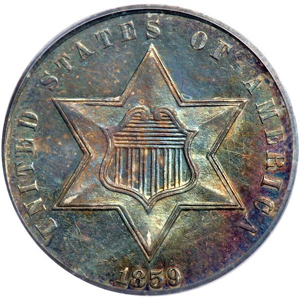 1859 Silver Three Cents. PCGS graded MS-63. Lovely rainbow toning on both sides. The obverse is slightly reflective and a Premium Quality coin for the grade (PCGS # 3677) .