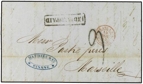 1859 Stampless envelope to FRANCE from MATHIEU & Co PINANG routed via India with boxed INDIA UNPAID, French entry cachet and charged "8" on arrival.