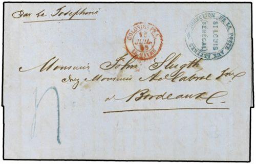 1859 Stampless envelope to FRANCE written from St. Louis cancelled DIRECTION DE LA POSTE AUX LETTRES ST. LOUIS (SENEGAL) in blue, charged "4", sent on the steamer "La Josephine" with French entry cachet in red. Very fine.