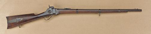 1859 U.S. issue military rifle, .52 caliber percussion, 30” barrel double set triggers serial #56535, in serial number range issued to Berdan Sharpshooters and other U.S. sharpshooter regiments. Refer Flayderman 5F-023.5. The rifle shows approx. 75-85% original blue, just starting to drift to patina with some light erosion and pinprick pitting, natural aging just starting. The Sharps address, New Model address and 1859 are crisp and legible. The R.S. Lawrence marked rear sight is retained. The barrel shows an OWA inspection near the breech. The lock and frame, lever, and plate, show considerable original case hardening drifting to patina, but at least 20-40% mixed in. The buttplate and patchbox show 30-40% case hardening mixing in their brown patina. The forend shows initials “A. W. N.” stamped at the rear of the forend at the flattened area just in front of the lever. The buttstock shows a select grain, almost of commercial quality with no inspections and fits impeccably and was never cartouched. The bore is fair and shows some roughness at the breech from firing and use. All original bands and small parts. The lock markings and patent markings are sharp and well defined.