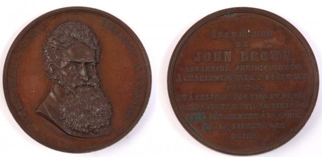 Bronze medal depicting bust ? r. of famed liberator in patriarchal beard, born Torrington, Vermont 1800. Rev. 11-line French tribute to leader of planned slave uprising at Charlestown, Virginia, December 1859, ?juridically assassinated with his sons and companions? for their devotion to the liberty of the Blacks.? By Jean W?rden, Brussels, Belgium. Deep red patina. About Uncirculated condition.