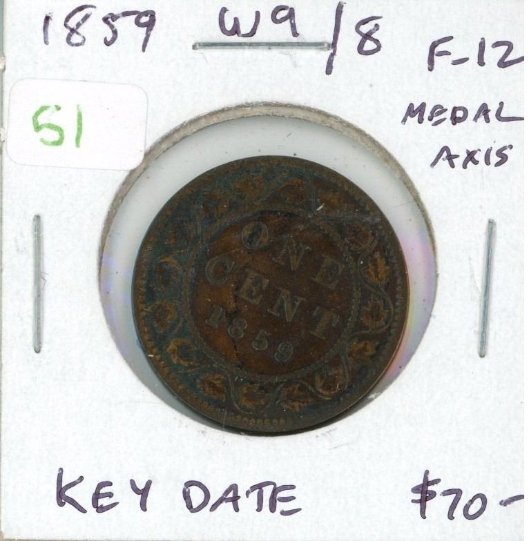 1859 W9/8 Canadian Victorian Large Cent. Medal Axis with 9/8. F-12. Key Date.