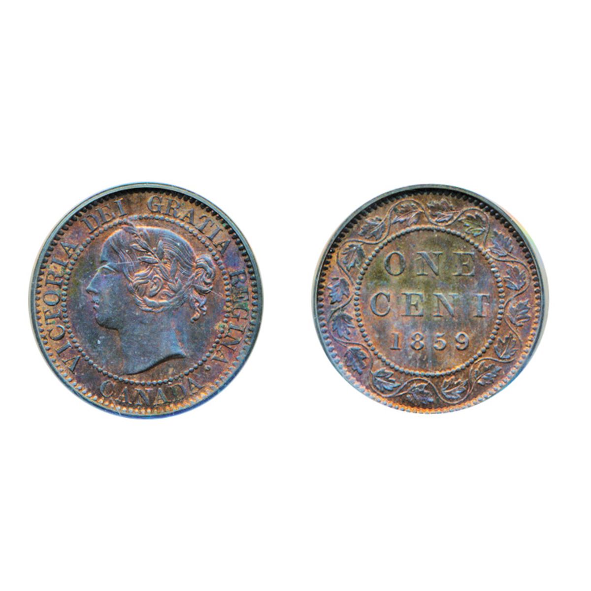 1859, Wide 9/8. PCGS graded Mint State-63. Red-Brown. 30% red luster. Another example of a ‘key’ date.
