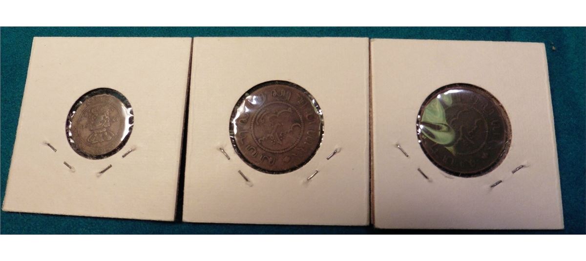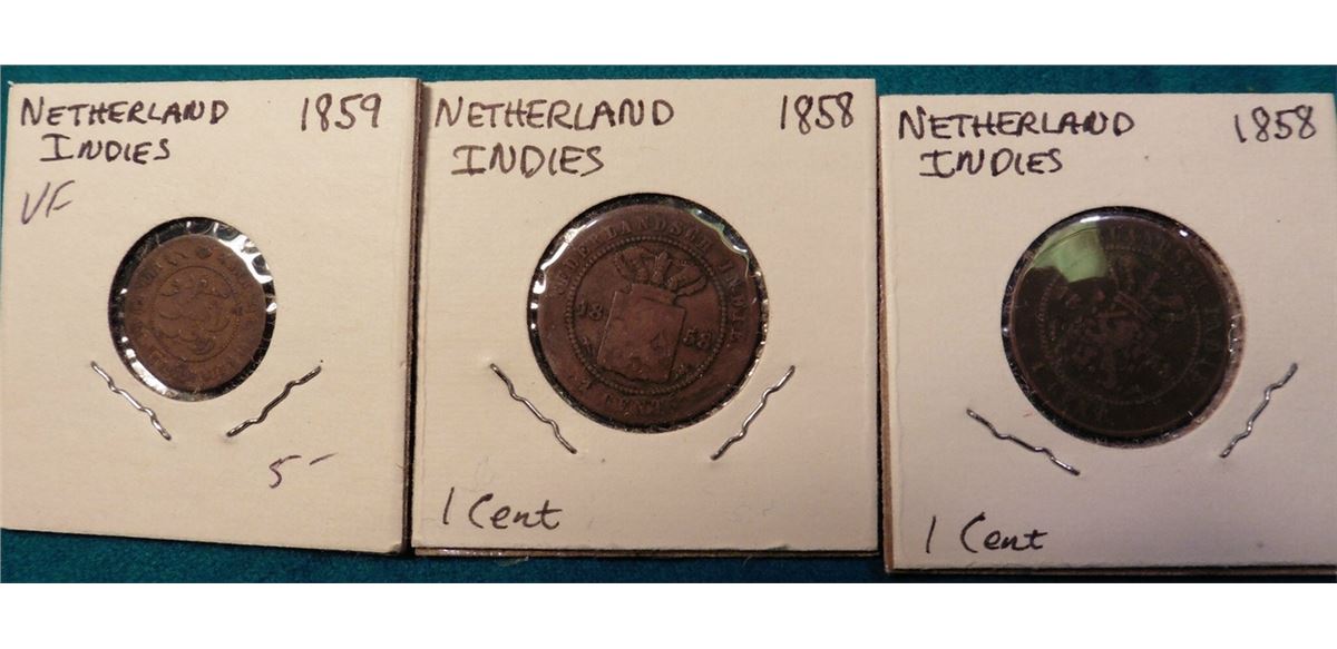 1859(u) Half Cent VF KM306 & (2) 1858(u) Kingdom of Netherlands East indies Cent KM307.2 F-VF.