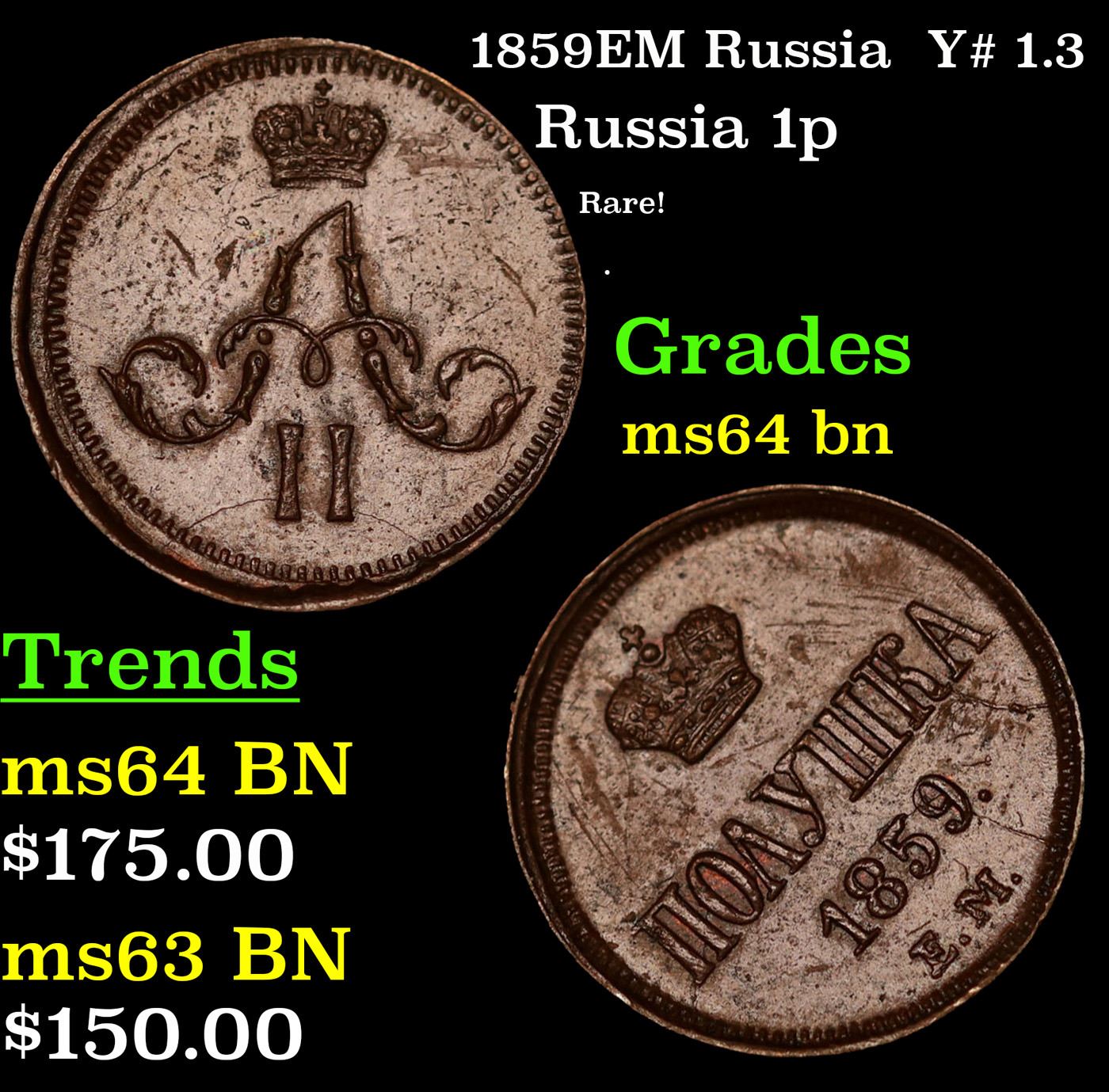 1859EM Russia Y# 1.3 Grades Choice Unc BN.