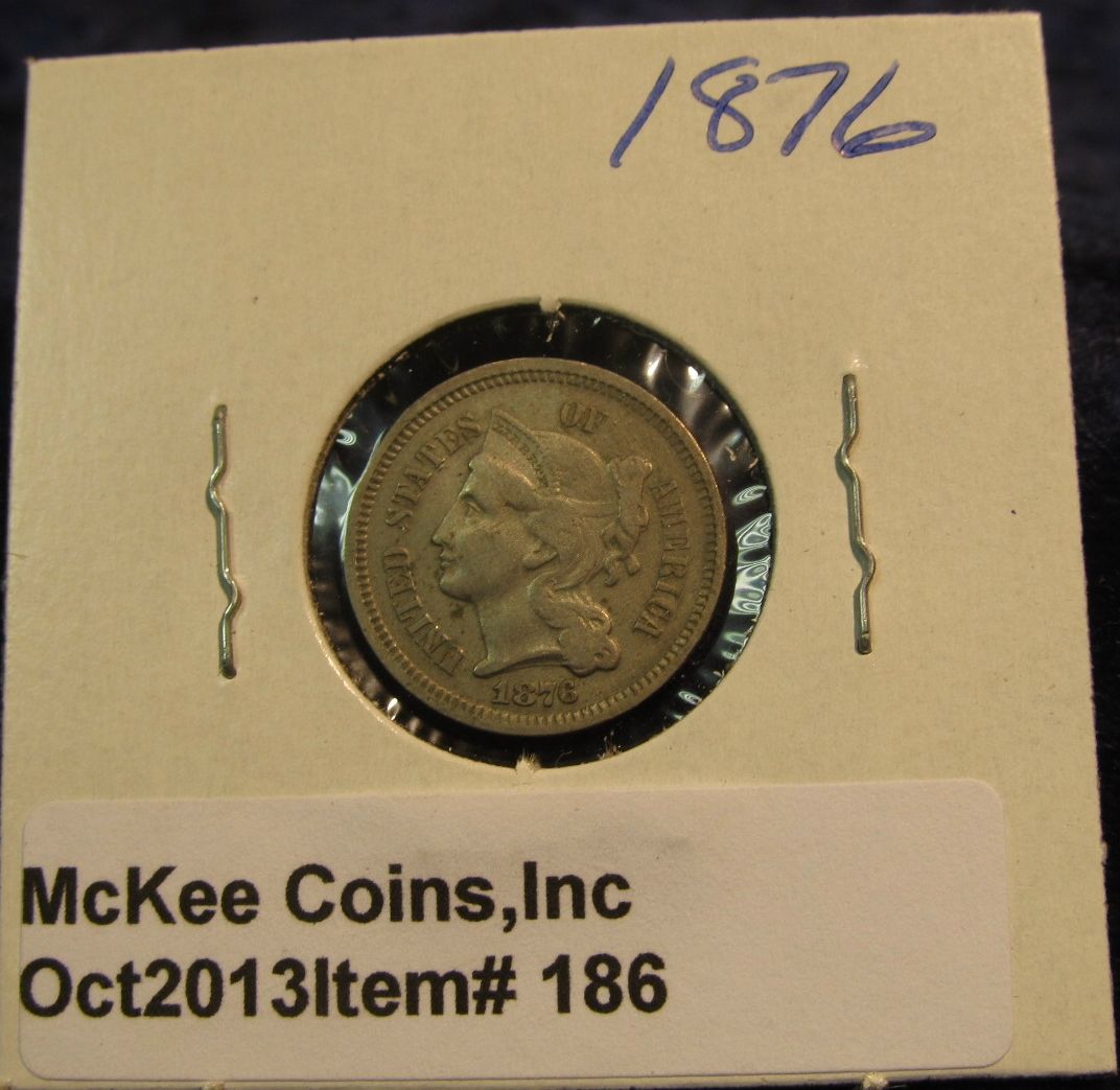 186. 1876 U.S. Three Cent Nickel. VF 20. Redbook value $35.00.