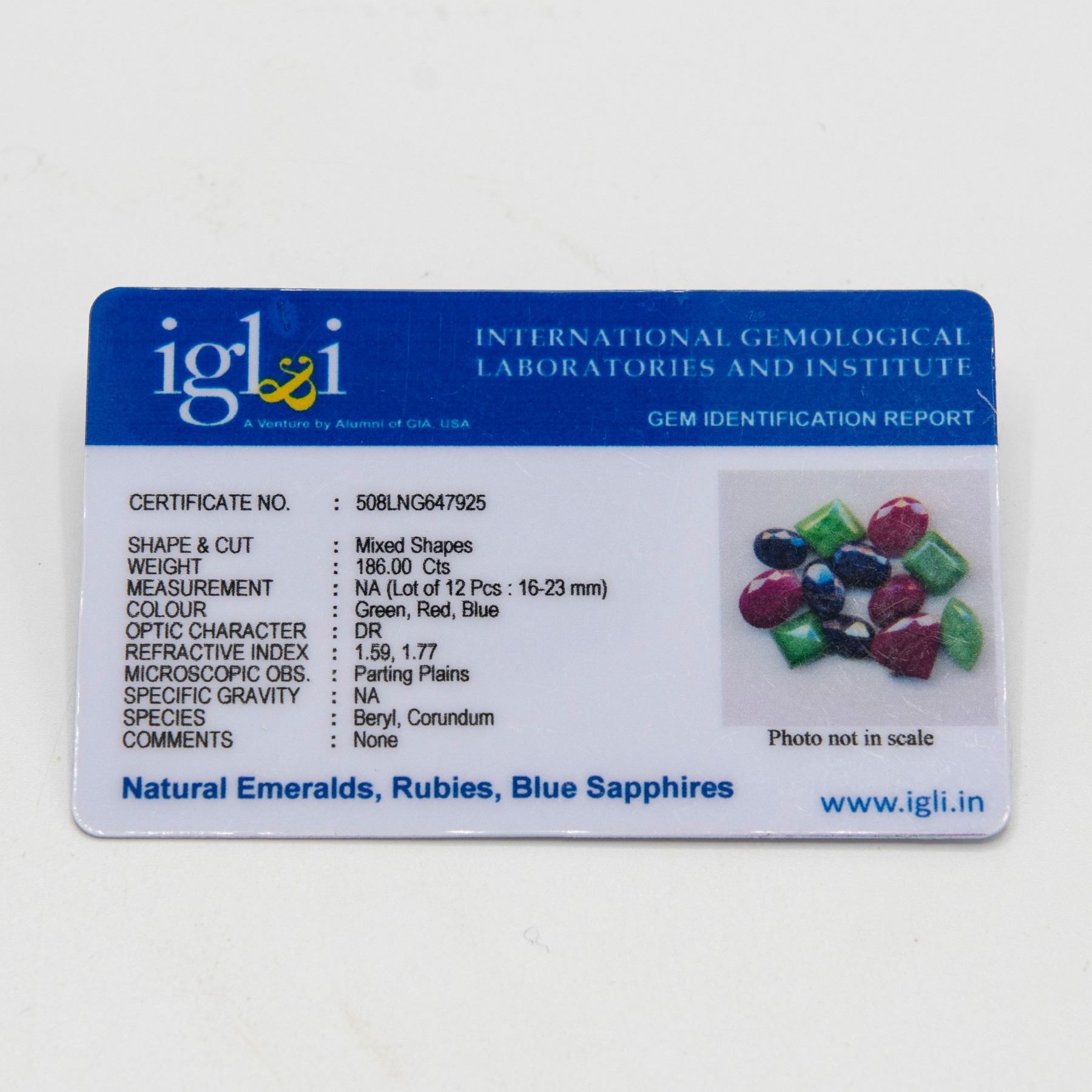 Impressive Certified 186 Cttw Parcel Of Emeralds, Rubies and Blue Sapphires. All gem sare cut and faceted displaying a vast selection of different cuts and colors. Please see certification for further details.