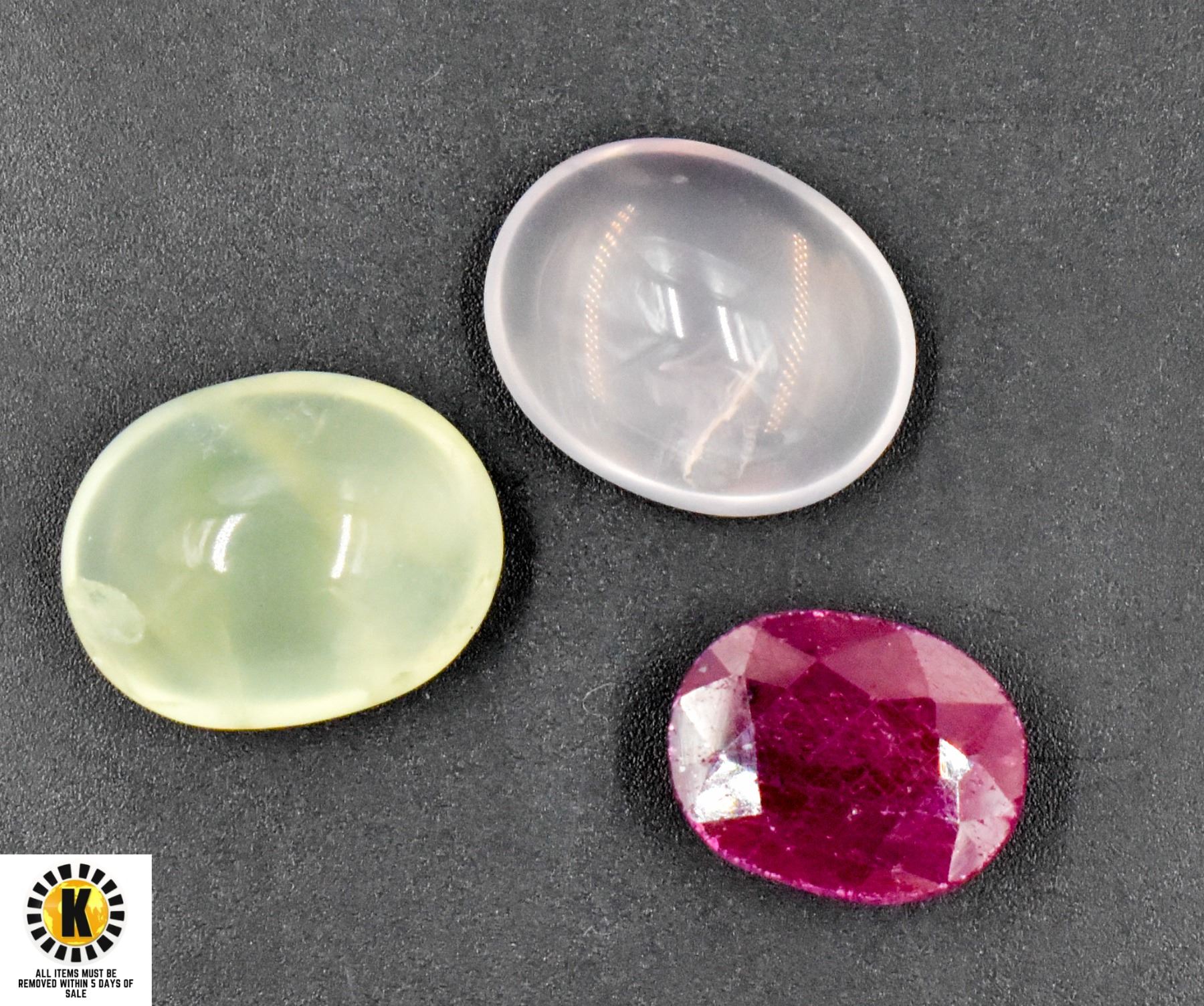 #186-NATURAL PRENITE, ROSE QUARTZ, RUBY 55.40CT
