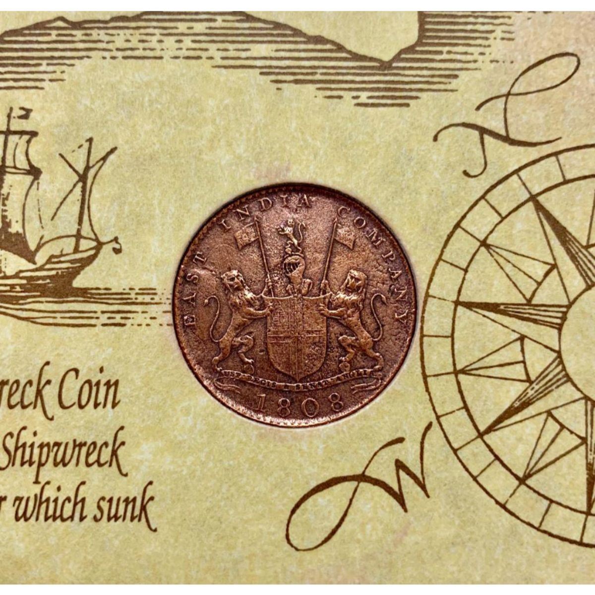 On January 25th, 1809, the Admiral Gardner set sail through the English Channel, headed for India. Early into the journey, a sudden and violent storm hit the channel just off Dover. Capetian William John Eastfield and his crew tried desperately to ride out the storm, but the mighty ship eventually succumbed to the great cataclysmic storm. It ran aground on the Goodwin Sands and, by the next morning, had sunk, claiming the precious coin cargo and the lives of four crew members. The coins were minted in Birmingham, England for use by the East India Company in the Madras Presidency. the obverse of each coin bears the East India Company arms. The motto underneath translates to, "Under the Patronage of the King and Parliament of England." The reverse of the "tens" and "twenties" are inscribed in Persian and translate, respectively to read, "Ten Cash are equal to Two Falus" and "Twenty Cash are equal to Four Falus. Please view photos for further details.Â