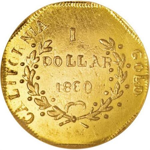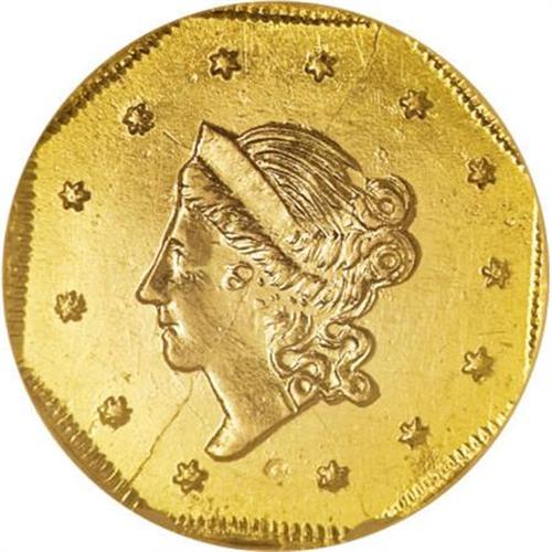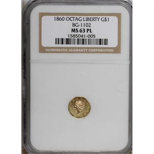 <B>1860 $1 Liberty Octagonal 1 Dollar, BG-1102, R.4, MS63 Prooflike NGC.</B></I> Die State II with a diagonal bisecting obverse die crack. A boldly struck piece whose reflective fields are smooth aside from a few trivial hairlines. The 0 in the date is widely repunched. Census: 1 in 63 Prooflike, 2 finer (7/07).<BR><BR><b>Shipping:</b> Coins & Currency (<a target="_blank" href="http://www.heritageauctions.com/common/shipping.php">view shipping information</a>)