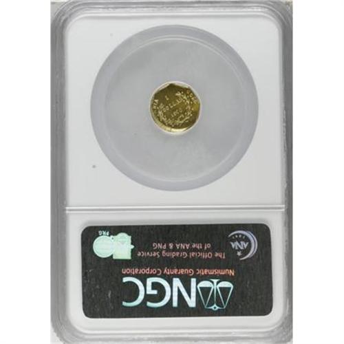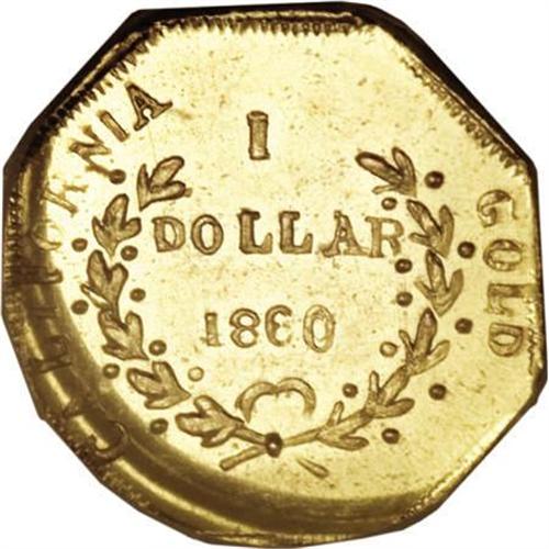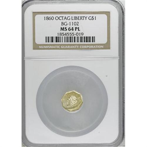 <B>1860 $1 Liberty Octagonal 1 Dollar, BG-1102, R.4, MS64 Prooflike NGC.</B></I> Both sides of this piece are fully brilliant with light yellow-gold color. The fields are entirely reflective and mirrored, with reflective devices, resulting in little cameo contrast. The early "fractional" gold dollars from the first period of California small denomination gold pieces are among the most desirable pieces in the series. Census: 2 in 64 Prooflike, 0 finer (6/07).<BR><BR><b>Shipping:</b> Coins & Currency (<a target="_blank" href="http://www.heritageauctions.com/common/shipping.php">view shipping information</a>)
