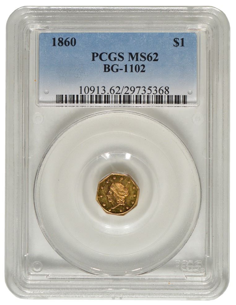 One 1860 $1 Gold Coin PCGS MS62 BG-1102.