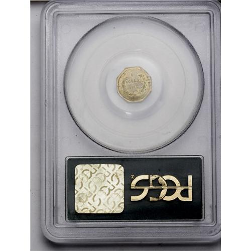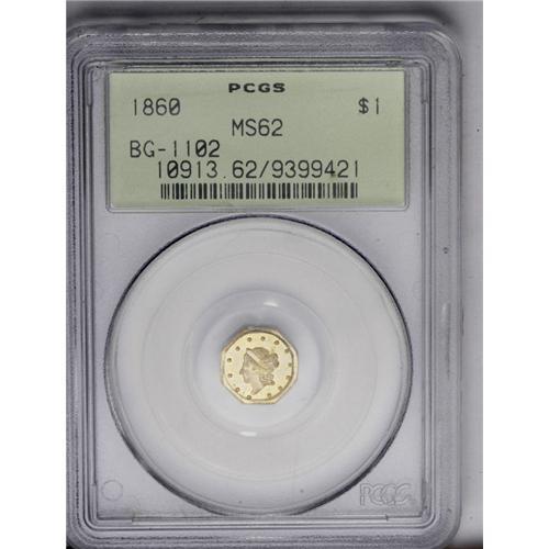 <B>1860<$1> Liberty Octagonal 1 Dollar, BG-1102, R.4, MS62 PCGS.</B></I> The 0 in the date is widely repunched, and a fine die crack extends from Liberty's neck to the rim below star 2. Green-gold color enhances the mildly lustrous surfaces on both the obverse and reverse. Nicely struck, except for a couple of stars along the lower right border. There are no mentionable marks to report.