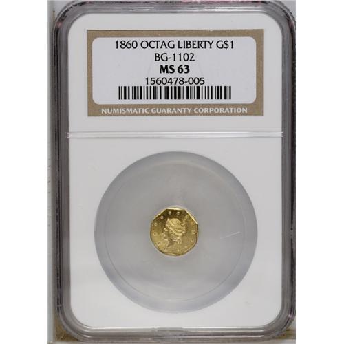 <B>1860 $1 Liberty Octagonal 1 Dollar, BG-1102, R.4, MS63 NGC.</B></I> The lightly abraded surfaces have a degree of flash and modest reflectivity. A Select yellow-gold representative. Census: 1 in 63, 2 finer (12/06).<BR><BR><b>Shipping:</b> Coins & Currency (<a target="_blank" href="http://www.heritageauctions.com/common/shipping.php">view shipping information</a>)