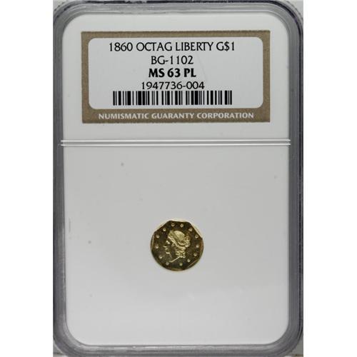 <B>1860 $1 Liberty Octagonal 1 Dollar, BG-1102, R.4, MS63 Prooflike NGC.</B></I> A flashy and boldly struck octagonal dollar whose eye appeal is limited only by a few tiny retained laminations, as produced. Census: 1 in 63 Prooflike, 2 finer (3/07).<BR><BR><b>Shipping:</b> Coins & Currency (<a target="_blank" href="http://www.heritageauctions.com/common/shipping.php">view shipping information</a>)