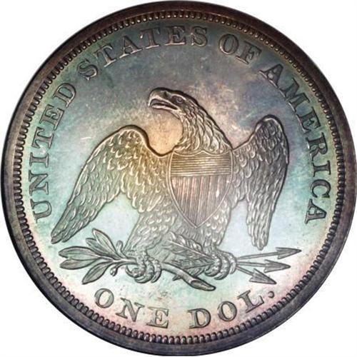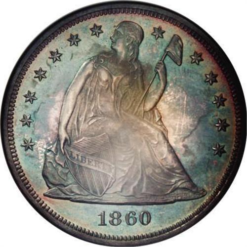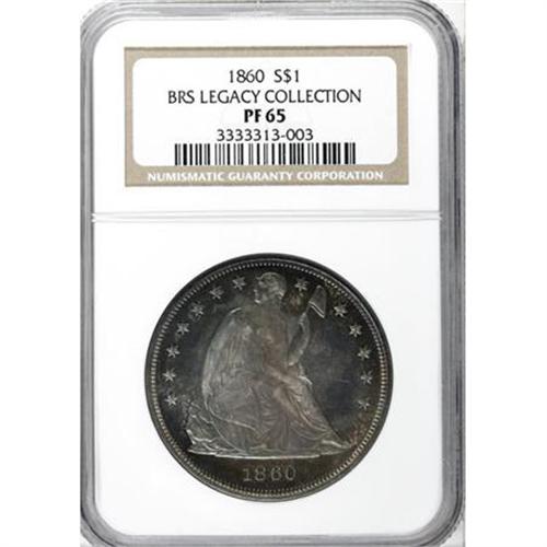 <B>1860 $1 PR65 NGC.</B></I> Ex: BRS Legacy Collection. Proof production of the 1860 dollar was exceptionally large at 1,330 pieces, the highest in the entire Seated Liberty dollar series. One thousand of these were included in proof sets for sale to the public. With respect to the other 330 coins, Walter Breen theorizes in his 1989 <I>Encyclopedia of United States and Colonial Proof Coins</B></I> that:<BR><BR> "The extra 330 minted over and above the 1,000 for sets, all on March 8, appear to have anticipated extra demand for silver dollars by souvenir hunters not wishing to buy complete sets. This did not materialize. Some 527 were sold, the rest melted."<BR><BR>Variegated sky-blue and faded purple patina adorn both sides of this attractive Gem. A powerful strike emboldens the design features, leaving no elements with even hints of softness. Close scrutiny of the surfaces indicate they have been well cared for. The few handling marks there are, though completely unobtrusive and inoffensive, likely preclude an even finer grade. Census: 18 in 65, 8 finer (11/07).<BR><BR><B>Coin Engraver:</B> Christian Gobrecht<BR><BR><b>Shipping:</b> Coins & Currency (<a target="_blank" href="http://www.heritageauctions.com/common/shipping.php">view shipping information</a>)