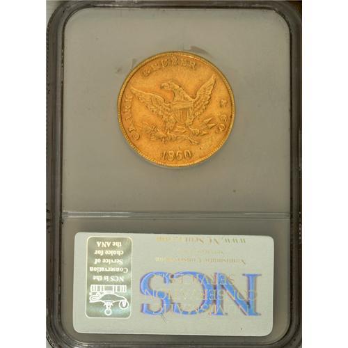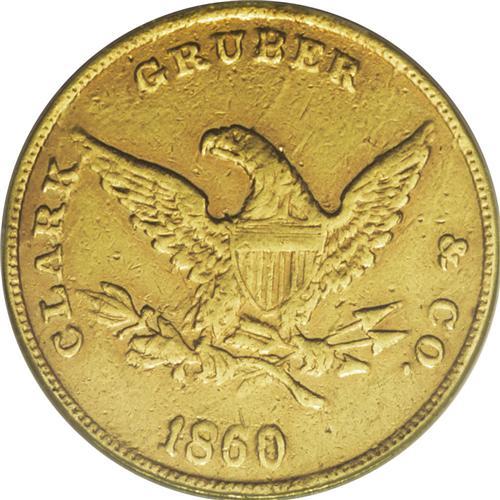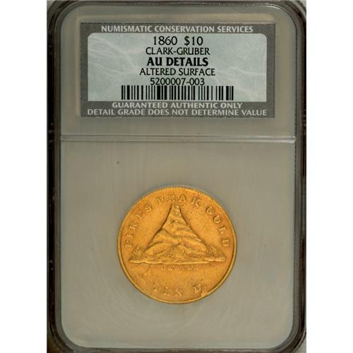 <B>1860 $10 Clark, Gruber & Co. Ten Dollar--Altered Surface--NCS. AU50 Details.</B></I> K-3, R.5. The surfaces have been whizzed, not overly harshly, to attempt to enhance the luster and smooth out some of the numerous abrasions present on both sides. An affordable example of this nonetheless-rare Territorial gold coin.<BR><I>From The Twin Hollows Collection.</B></I><BR><BR><b>Shipping:</b> Coin/Currency (<a target="_blank" href="http://www.heritageauctions.com/common/shipping.php">view shipping information</a>)