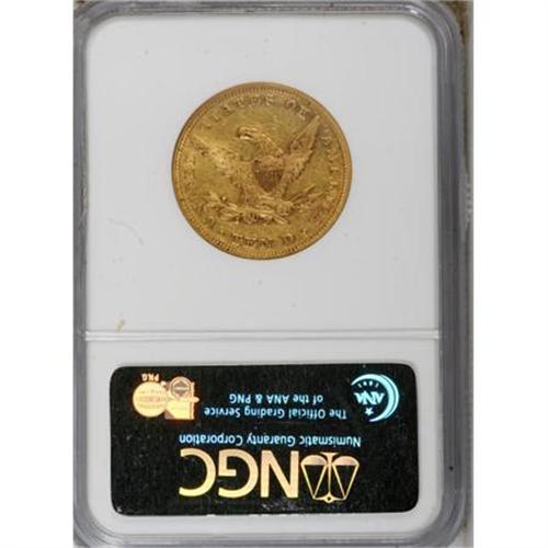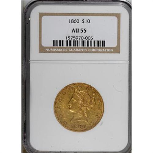 <B>1860 $10 AU55 NGC.</B></I> Six-fold or "bulging" bun subtype. Luster illuminates protected areas. Crisply struck, and smooth for the grade aside from a few marks above the eagle's head. A mere 15,055 pieces were struck during this Pony Express year. Census: 20 in 55, 33 finer (8/07).<BR><BR><B>Coin Engraver:</B> Christian Gobrecht<BR><BR><b>Shipping:</b> Coins & Currency (<a target="_blank" href="http://www.heritageauctions.com/common/shipping.php">view shipping information</a>)