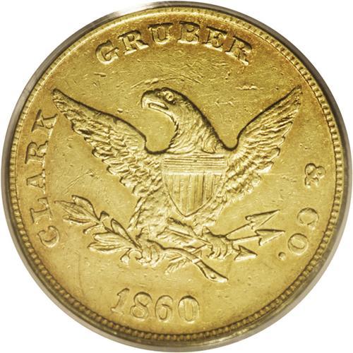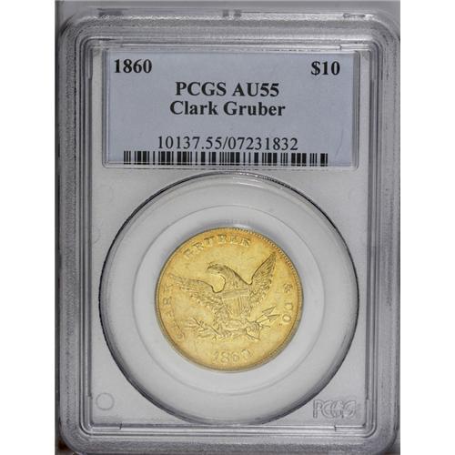 <B>1860<$10> Clark, Gruber & Co. Ten Dollar AU55 PCGS.</B></I> K-3, R.5. Clark, Gruber & Co. established a private mint in Denver, Colorado, to provide gold coinage to the surrounding area after the discovery of the precious metal in Colorado. In 1860, when this coin was minted, the area was still known as the Jefferson Territory. In 1863 the U.S. government bought the Clark, Gruber facility to turn it into a mint, but then Congress determined to use the building only as a U.S. Assay Office. It was not until 1906 that the former Clark, Gruber facility--in much remodeled form--finally became a branch mint of the United States.<BR> This sparkling example has tons of luster and phenomenal surfaces, appearing much more like a late-19th century federal eagle than a mid-century Territorial gold piece. The color is a lovely sunset-orange with deeper rim hues, and there are remarkably few surface impairments. A beautiful and highly collectible example. Listed on page 362 of the 2007 <I>Guide Book.</B></I>