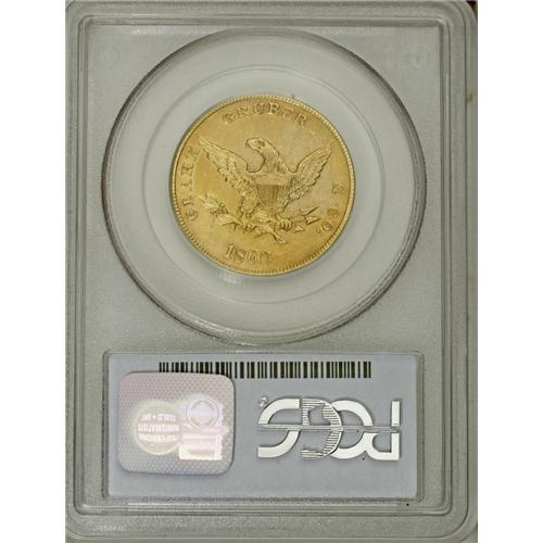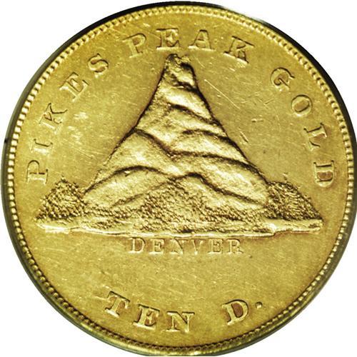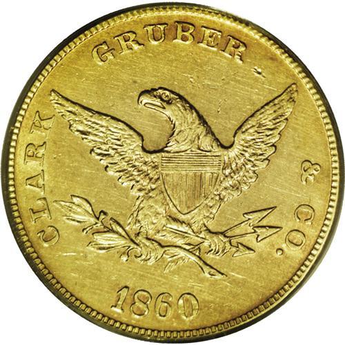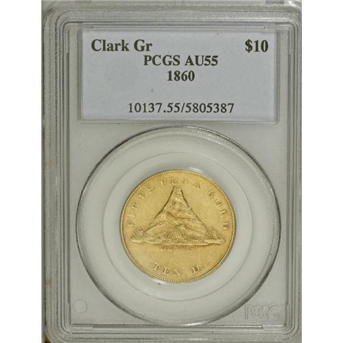 <B>1860 $10 Clark, Gruber & Co. Ten Dollar AU55 PCGS.</B></I> K-3, R.5. The start of the Colorado Gold Rush followed that of California by almost exactly ten years. The stage was set for a local mint in Denver, and there to fill the void was Clark, Gruber, & Co. Coinage totaled approximately $120,000 between July and October of 1860. In 1863, the federal government purchased the facility, which served as a U.S. Assay Office prior to the erection of a Federal Mint in 1906.<BR> 1860 Clark, Gruber ten dollar pieces are rare in any grade. On the present example, the highpoints show only a trace of wear. A few scattered marks are present on each side, but none are individually distracting. The green-gold surfaces are clean, and retain ample luster. The "Pike's Peak" motif, and the fictitious rendering of the mountain, have made this piece popular among collectors for decades. This attractive example should inspire bidders, and will be a highly valued historic relic and numismatic treasure to its next owner. Listed on page 362 of the 2007 <I>Guide Book.</B></I><BR><I>From The Jones Beach Collection.</B></I><BR><BR><b>Shipping:</b> Coin/Currency (<a target="_blank" href="http://www.heritageauctions.com/common/shipping.php">view shipping information</a>)