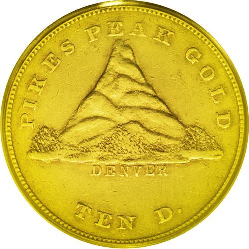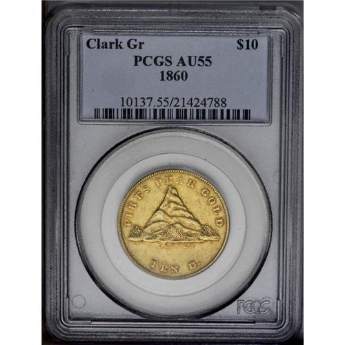 <B>1860<$10> Clark, Gruber & Co. Ten Dollar AU55 PCGS.</B></I> K-3, R.5. After gold was discovered in Colorado, the firm of Clark, Gruber & Co. established a mint in Denver to provide coinage to the surrounding area. This entire area was originally part of the Kansas Territory, but eventually became Jefferson Territory, Colorado Territory, and finally, the State of Colorado. Denver was first named Denver City, in honor of John W. Denver, the governor of Kansas Territory. At the time these coins were minted in 1860, the region was still known as Jefferson Territory.<BR> This is a pleasing green-gold example with considerable luster and only slight wear on the highest design points. The surfaces are accented by hints of orange color. Each side has limited abrasions and hairlines, consistent with the grade. A splendid example of the whimsically designed ten dollar gold piece that features an unusual, triangular mountain. Some have suggested the appearance of a volcano. Listed on page 362 of the 2007 <I>Guide Book.</B></I><BR><I>From The Long Beach Family Collection.</B></I>
