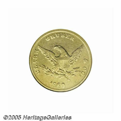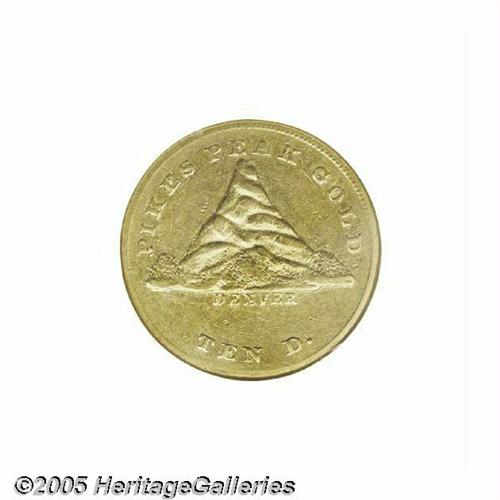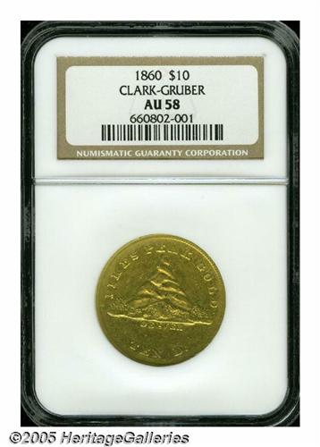 <B>1860<$10> Clark, Gruber & Co. Ten Dollar AU58 NGC.</B></I> K-3, R.5. Labeled PIKE'S PEAK GOLD on the obverse, the origin of the gold from which these coins were struck is definitely from Colorado. However, one cannot escape the imaginative representation of Pike's Peak that was engraved into the obverse die by the staff of Bailey and Company, who had never seen the mountain. As with the California gold strike from a dozen years before, once news of gold in Colorado brought miners and camp followers to the gold fields of Colorado the need for conversion of raw bullion into coin form became immediate. The firm of Clark, Gruber stepped in to fill that need, and did so for two years until selling their firm and building to the United States as an Assay Office (later the Denver mint). This is a well struck example that shows just a trace of friction over the highpoints of the devices. Bright olive-gold coloration overall with a number of small handling marks peppered over each side. Very rare in such a superior state of preservation. Listed on page 309 of the 2005 <I>Guide Book.</B></I> Population: 8 in 58, 15 finer (6/05).<BR><I>From The Great Western Collection of Territorial Gold.</B></I>