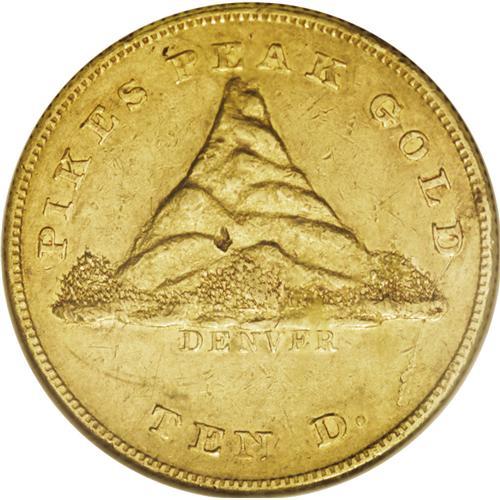 <B>1860 $10 Clark, Gruber & Co. Ten Dollar MS60 NGC.</B></I> K-3, R.5. The Clark, Gruber gold coinage was produced in 1860 and 1861. Six out of eight issues were patterned after the federal gold coins, with a Liberty Head, 13 stars, and the date on the obverse, and with an eagle, denomination, and legend on the reverse. The other two issues, the 1860 $10 and $20 coins, had a triangular mountain on the obverse, said to be Pikes Peak but obviously not familiar to the engraver, who must have been from the East.<BR> This is a pleasing Mint State piece with bright green-gold color and lighter yellow luster near the borders. The obverse has a raised ridge of metal from the D of GOLD, through the right base of the mountain, and down toward the rim at 5 o'clock. It is apparently a minor planchet lamination, but may have an associated die crack. Listed on page 362 of the 2007 <I>Guide Book.</B></I> Census: 6 in 60, 11 finer (11/06).<BR><BR><b>Shipping:</b> Coin/Currency (<a target="_blank" href="http://www.heritageauctions.com/common/shipping.php">view shipping information</a>)