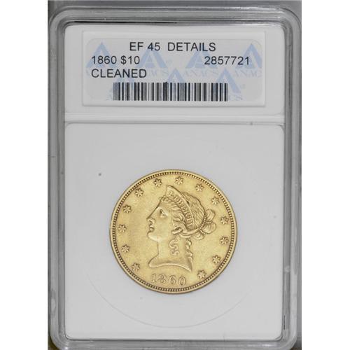 1860 $10 --Cleaned--ANACS. XF45 Details. The obverse is 1860[$10]--Cleaned--ANACS. XF45 Details.