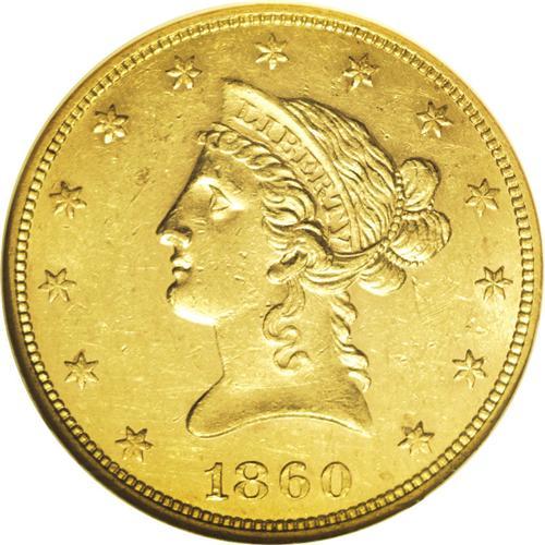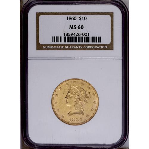 1860 $10 MS60 NGC. The 1860 ten dollar, with a mintage 1860[$10] MS60 NGC.