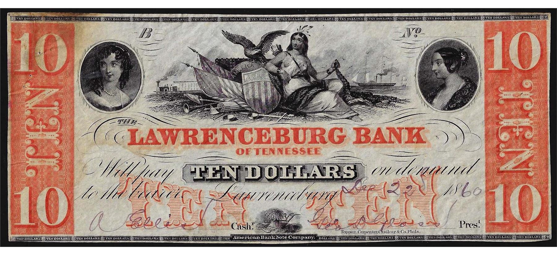 One 1860 $10 The Lawrenceburg Bank of Tennessee Obsolete Note.