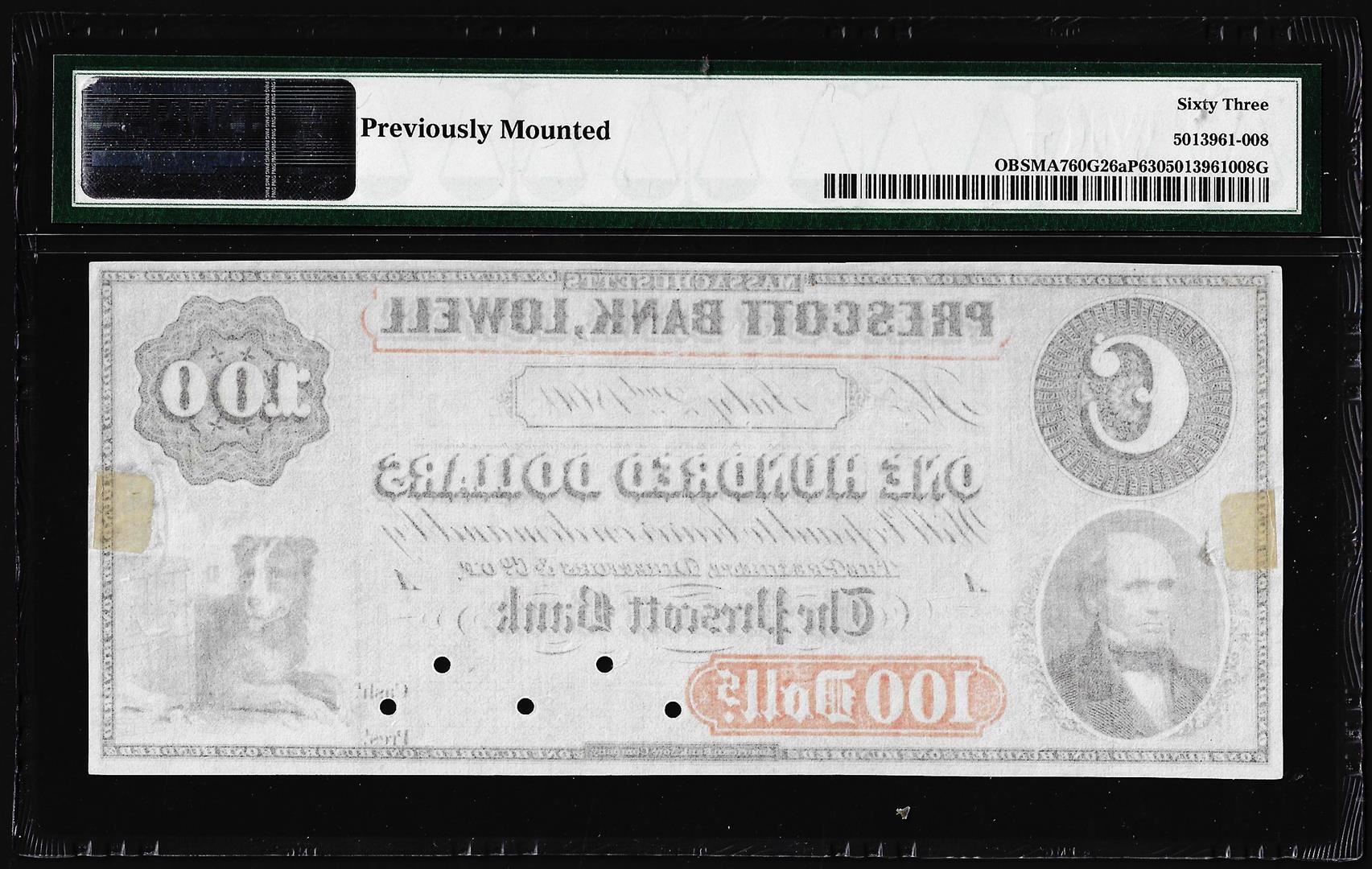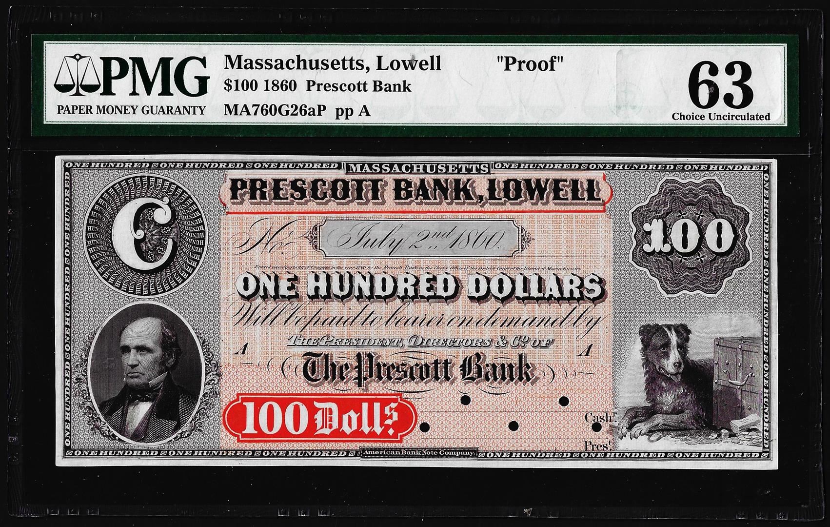 One 1860 $100 Prescott Bank Lowell, MA Proof Obsolete Note G26a PMG Choice Uncirculated 63. The bank opened in 1850 and remained in business until 1865 when it became the Prescott National Bank of Lowell (Charter Number 960). With amazing red and gray tints, this note has an unidentified male portrait (probably of someone associated with the bank) and a larger than usual vignette of Fidelity with the often used representation of a dog lying by a strong box with a key under its paw. This note is the Haxby plate note with the POC pattern precisely matching that found on this note. In addition, two hinge remnants on the back left and right margins offer a strong suggestion that the provenance on this note possibly stretches as far back as D.C. Wismer in the 1930s. PMG Certified.