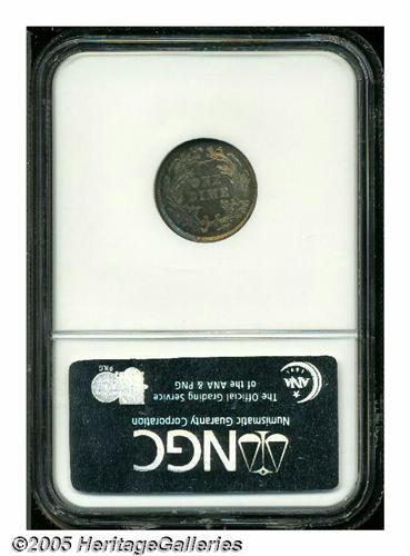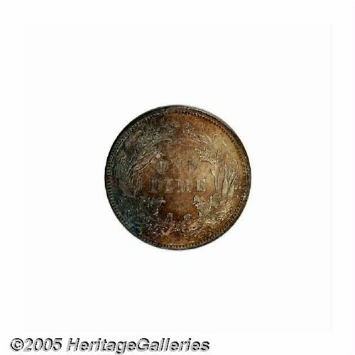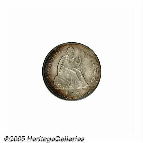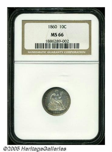 <B>1860<10C> MS66 NGC.</B></I> Slightly weak on Liberty's head, but reasonably well detailed elsewhere, this carefully preserved premium Gem displays lovely original toning, which becomes dramatic in intensity on the reverse, where deep hues of coppery-gold and cobalt-blue are evident. A small contact mark, just below the second S in STATES, is the only minor surface distraction on either side of the coin. Minor clash marks are present on each die. Population: 9 in 66, 2 finer (6/05).