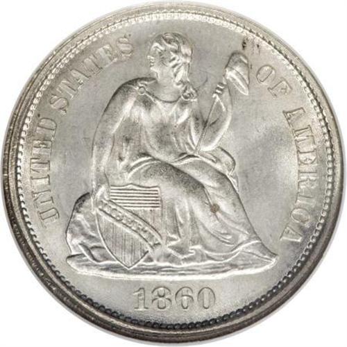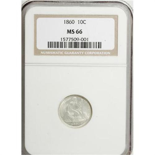 <B>1860 10C MS66 NGC.</B></I> Whispers of barely discernible light tan color visit the lustrous surfaces of this sharply struck Premium Gem. A small toning spot is visible on the right (left facing) ankle. Census: 10 in 66, 2 finer (12/07).<BR><BR><B>Coin Engraver:</B> Christian Gobrecht<BR><BR><b>Shipping:</b> Coins & Currency (<a target="_blank" href="http://www.heritageauctions.com/common/shipping.php">view shipping information</a>)