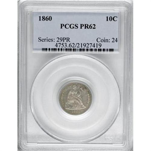 <B>1860 10C PR62 PCGS.</B></I> Bright proof surfaces display tints of light gold-brown and sharply struck motifs. Light hairlines define the grade.<BR><BR><B>Coin Engraver:</B> Christian Gobrecht<BR><BR><b>Shipping:</b> Coins & Currency (<a target="_blank" href="http://www.heritageauctions.com/common/shipping.php">view shipping information</a>)