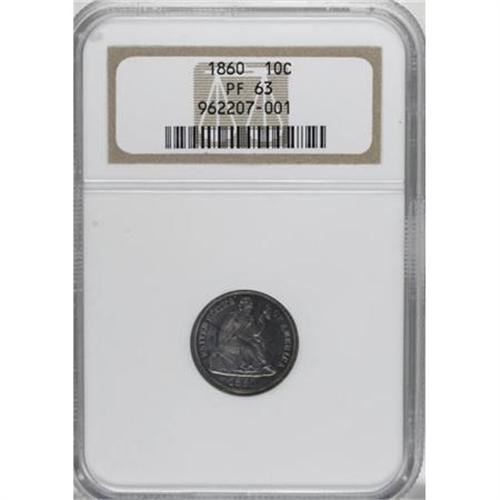 <B>1860 10C PR63 NGC.</B></I> NGC Census: (22/90). PCGS Population (26/78). Mintage: 1,000. Numismedia Wsl. Price for NGC/PCGS coin in PR63: $400. (#4753)<BR><BR><B>Coin Engraver:</B> Christian Gobrecht<BR><BR><b>Shipping:</b> Coins & Currency (<a target="_blank" href="http://www.heritageauctions.com/common/shipping.php">view shipping information</a>)