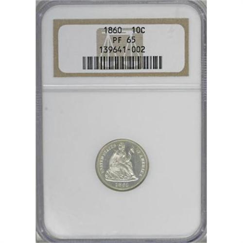 <B>1860 10C PR65 NGC.</B></I> Faintly smoky ivory patina occurs over both sides. A well struck Gem proof that has noticeable cameo contrast, although this attribute is not noted on the insert. The first proof issue with the legend UNITED STATES OF AMERICA on the obverse. Census: 17 in 65, 26 finer (10/07). <BR><BR><BR><B>Coin Engraver:</B> Christian Gobrecht<BR><BR><b>Shipping:</b> Coins & Currency (<a target="_blank" href="http://www.heritageauctions.com/common/shipping.php">view shipping information</a>)